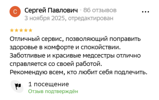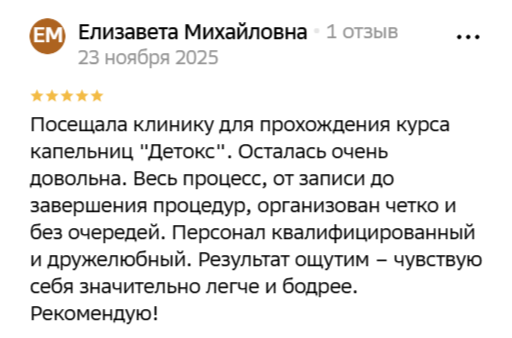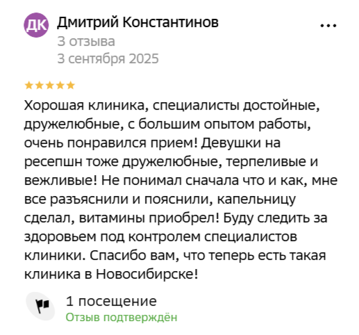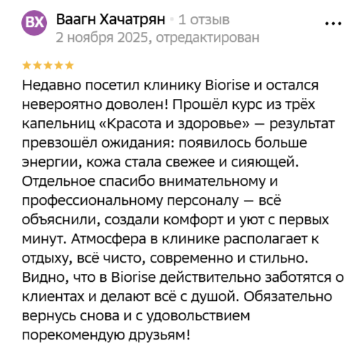 Отзывы наших клиентов — это истории их успешного оздоровления и уверенности в качестве предоставленных услуг. Мы гордимся каждым пациентом и благодарны за ваше доверие. Посмотрите, что говорят наши клиенты о нашей клинике капельниц в Новосибирске BIORISE.